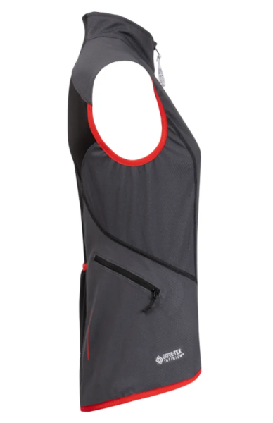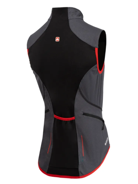 Prenda para ciclismo u otro deporte aeróbico de alta exigencia. Combina GORE-TEX Infinium Windstopper® en la parte frontal y trasera para proteger al usuario del viento, y POLARTEC® Power Stretch en la espalda para mejorar la movilidad. Tiene dos bolsillos a ambos lados de la zona lateral de la espalda, con cierre (apto para celular) y uno central elastizado.